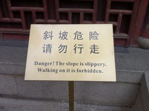 This sign was positioned next to a staircase with sloped marble sides, and was ostensibly designed to discourage English-speaking tourists from walking up the ramp edges instead of using the stairs. (As someone who has mistakenly worn flip-flops in the rain to many Asian heritage sites with marble floors, they’re not kidding even at all about the slippery nature of the walking surfaces.)
