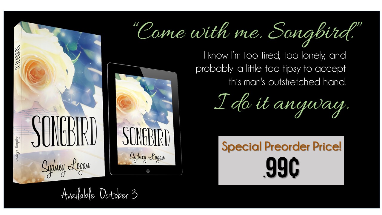 Sydney Logan’s upcoming book, Songbird, is now available at a special pre-order price on Amazon Kindle, iBooks, Nook, and Kobo. Grab the ebook while it’s just $0.99! This awesome price only lasts until release day (Saturday, October 3), so pre-order today!